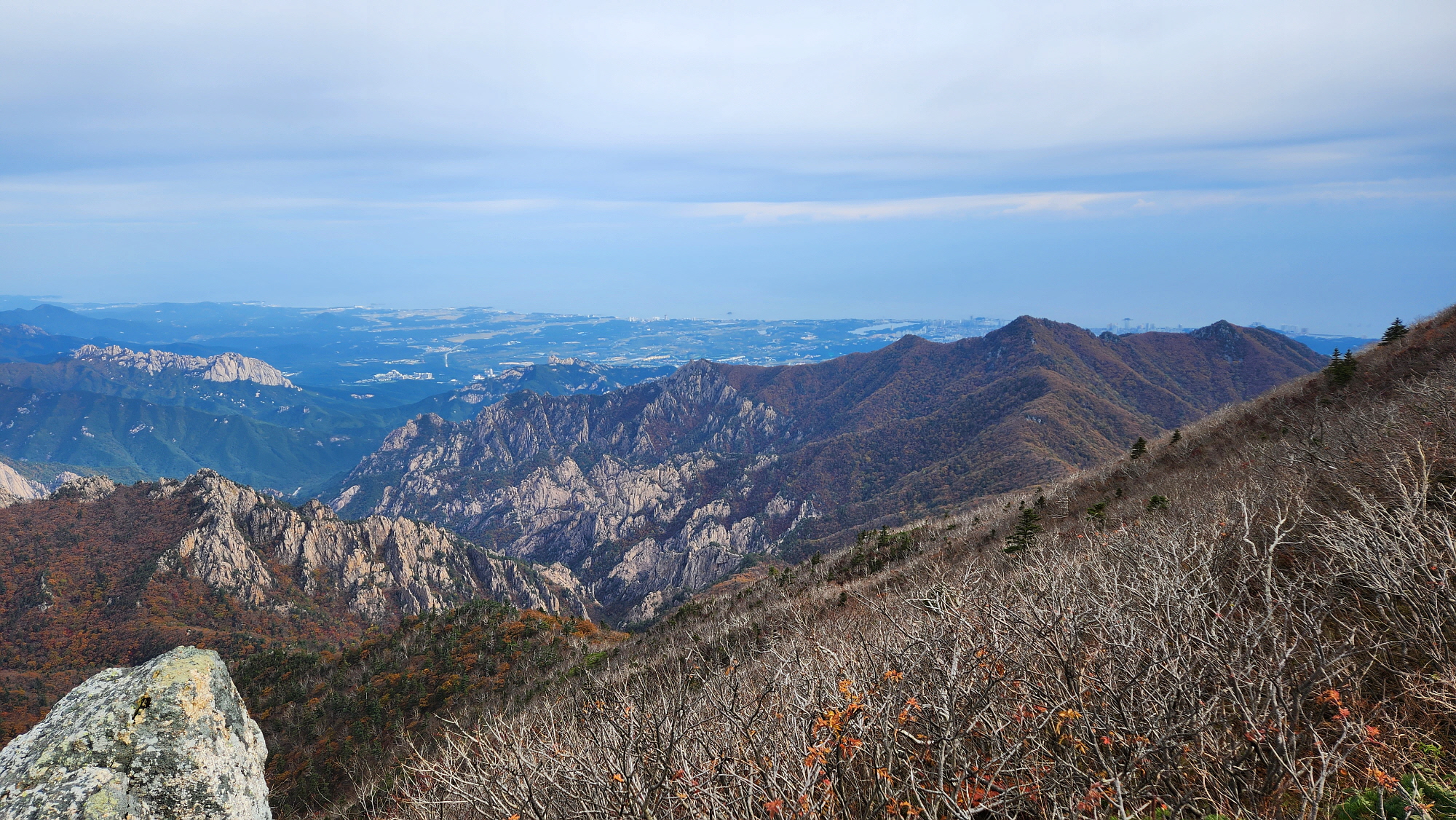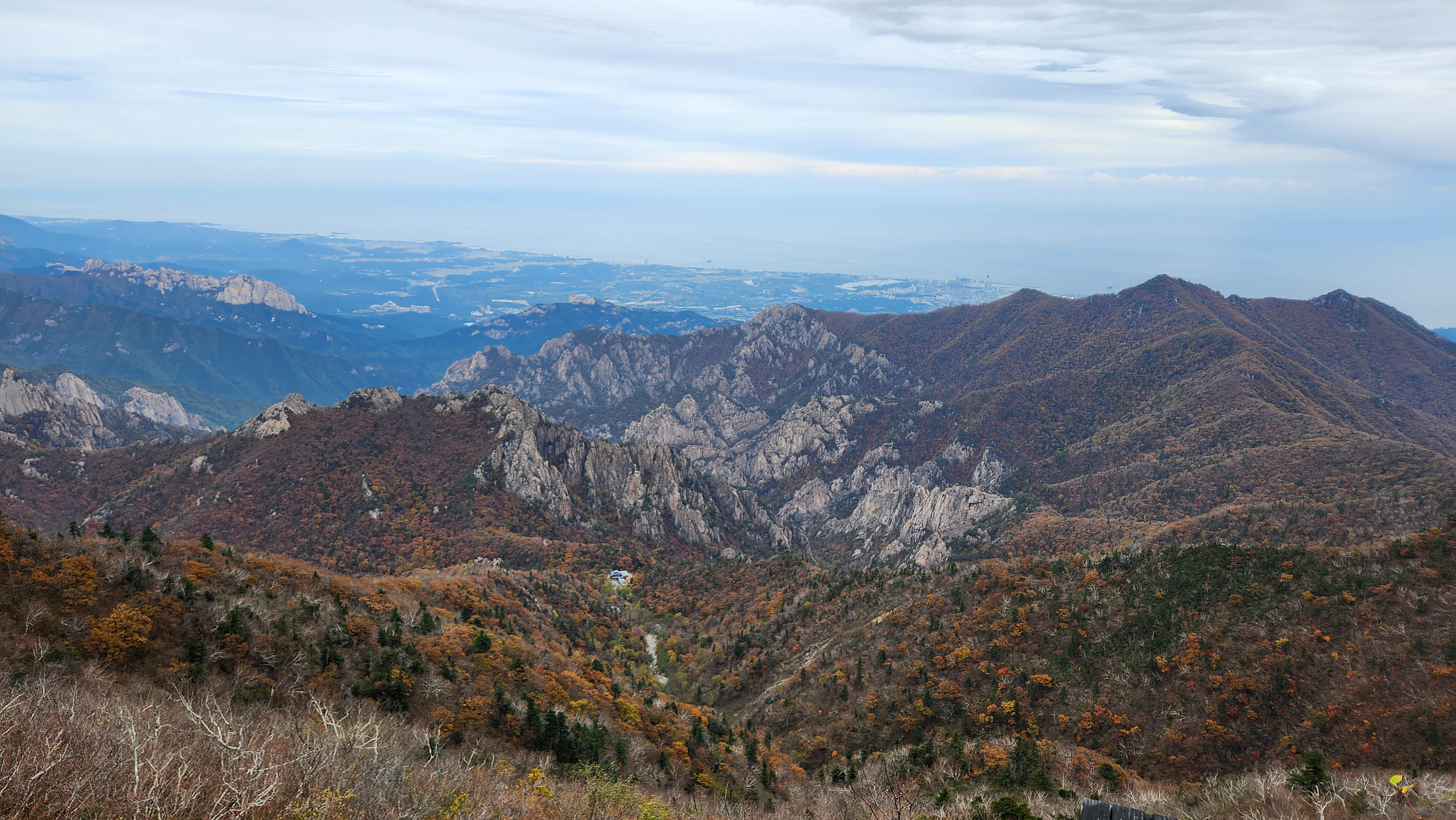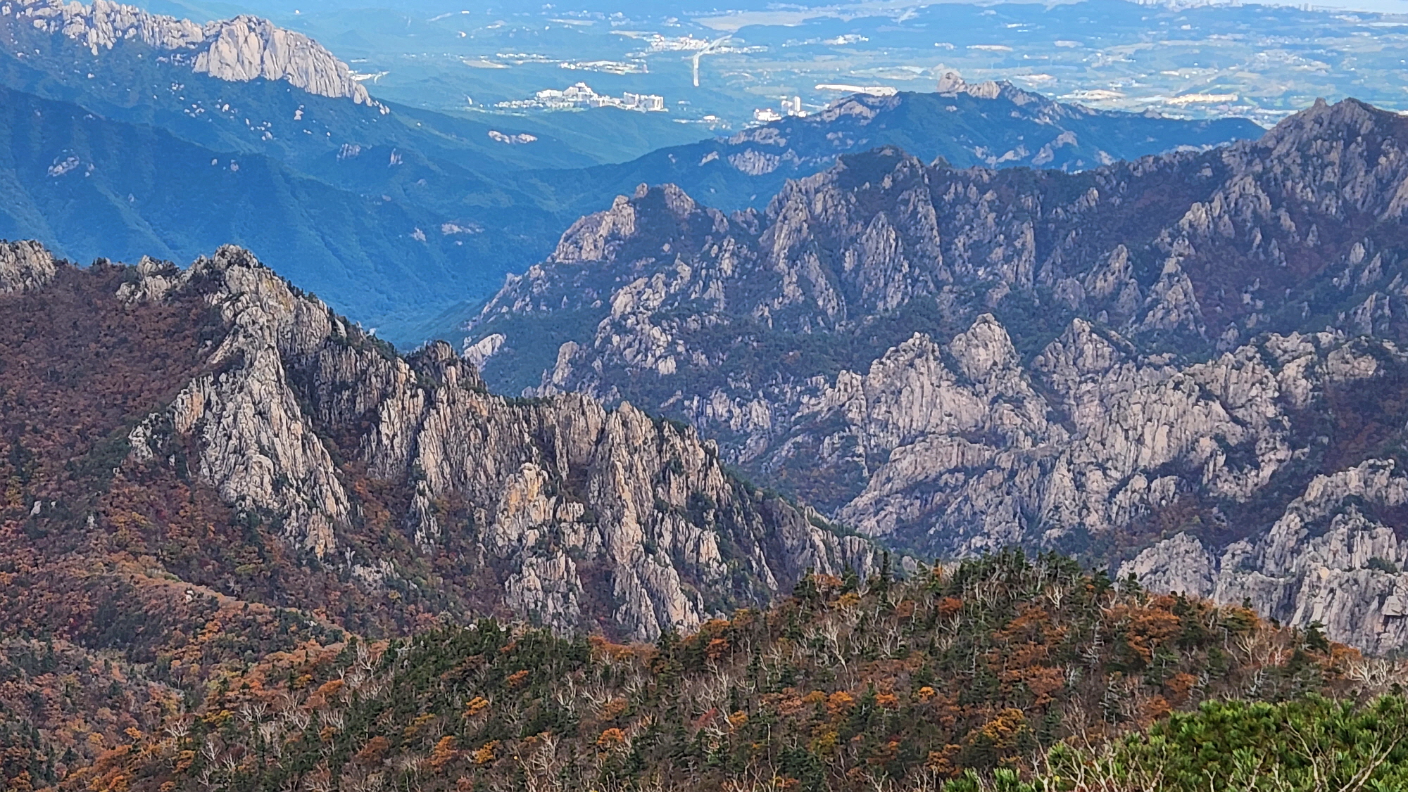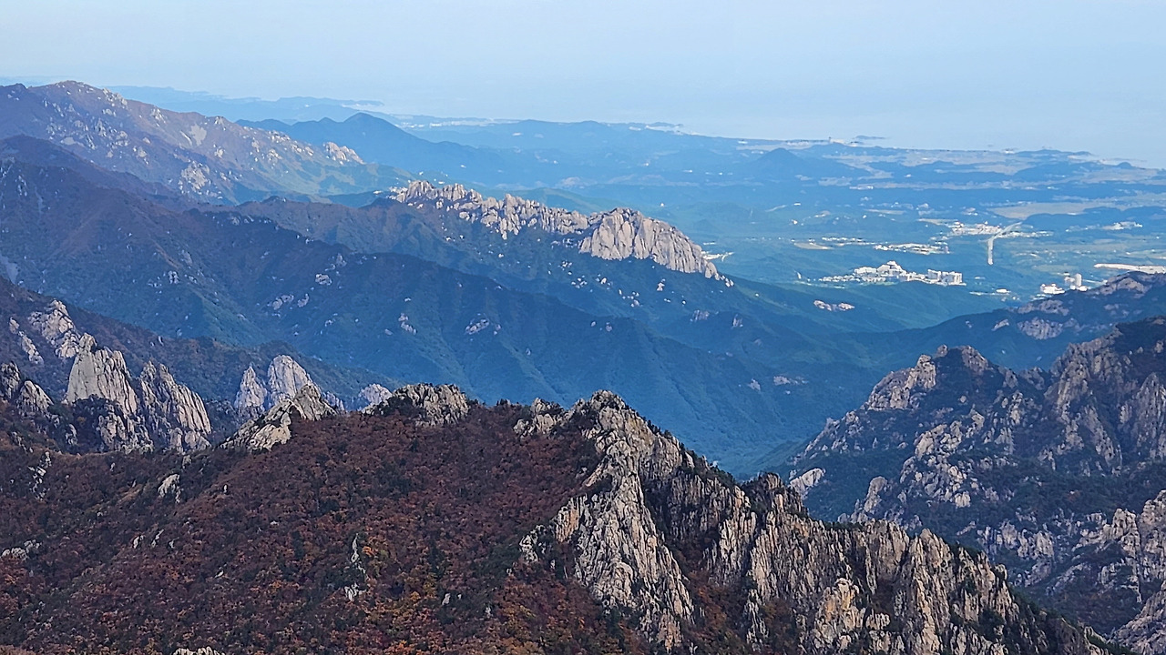 뒤로 울산바위가 아득히 보이고 뒤로 속초 앞 동해바다, 바다가 잘 보이지 않지만 육지 끝부터...!