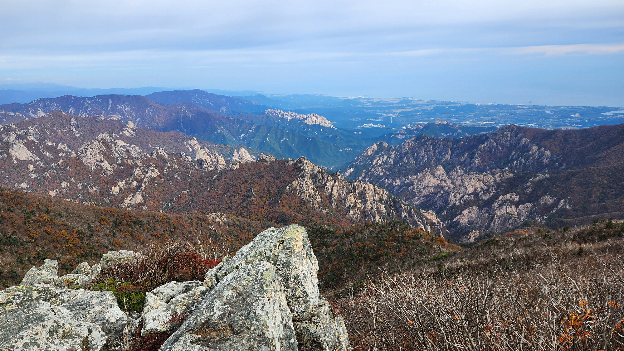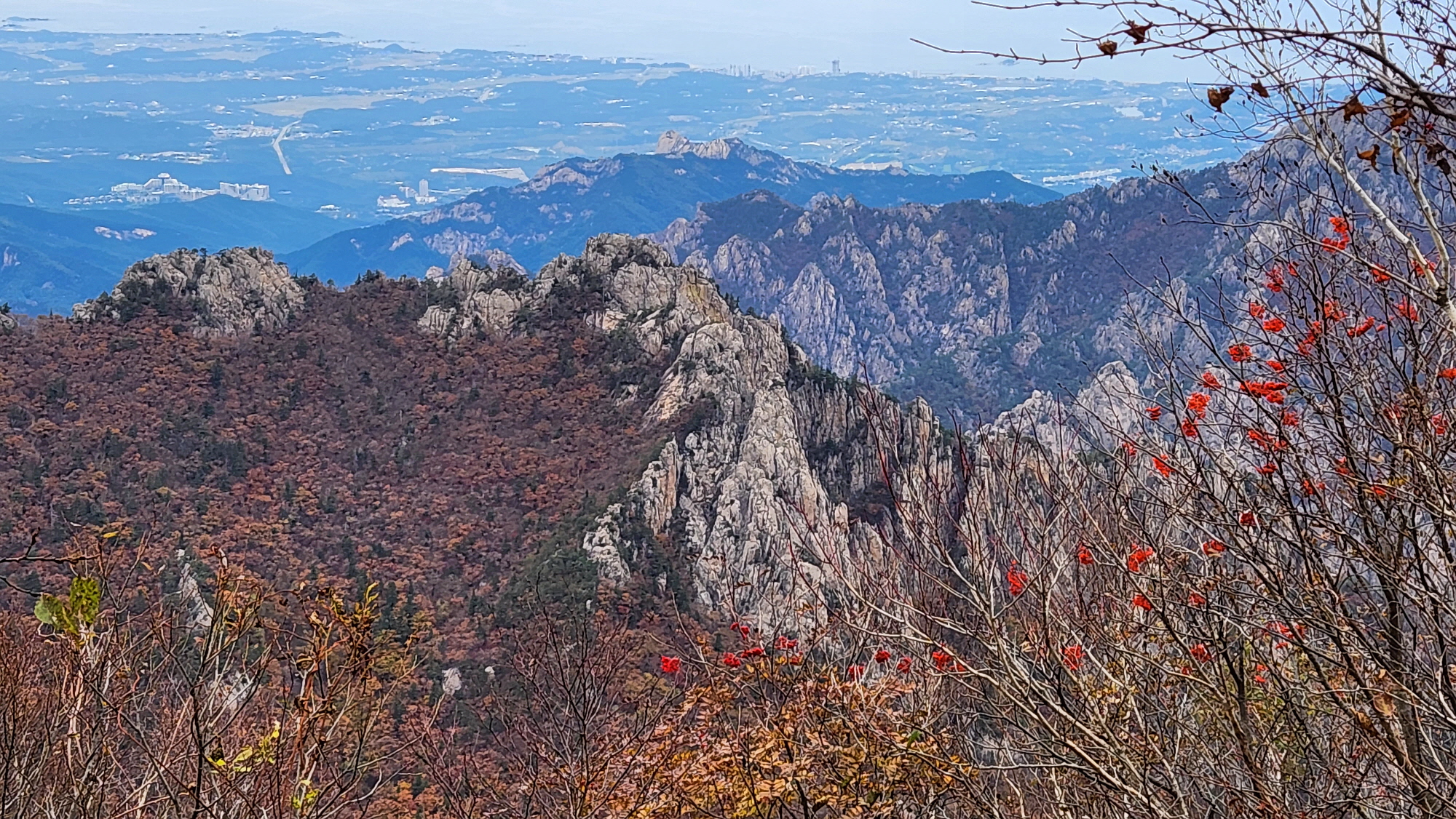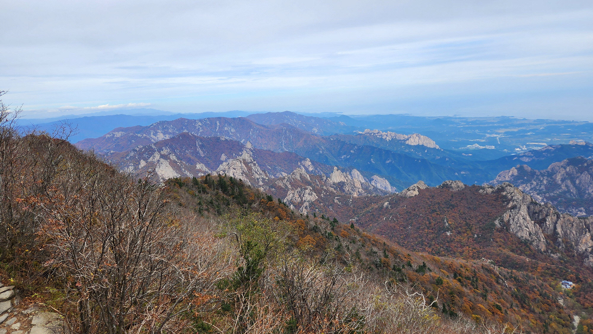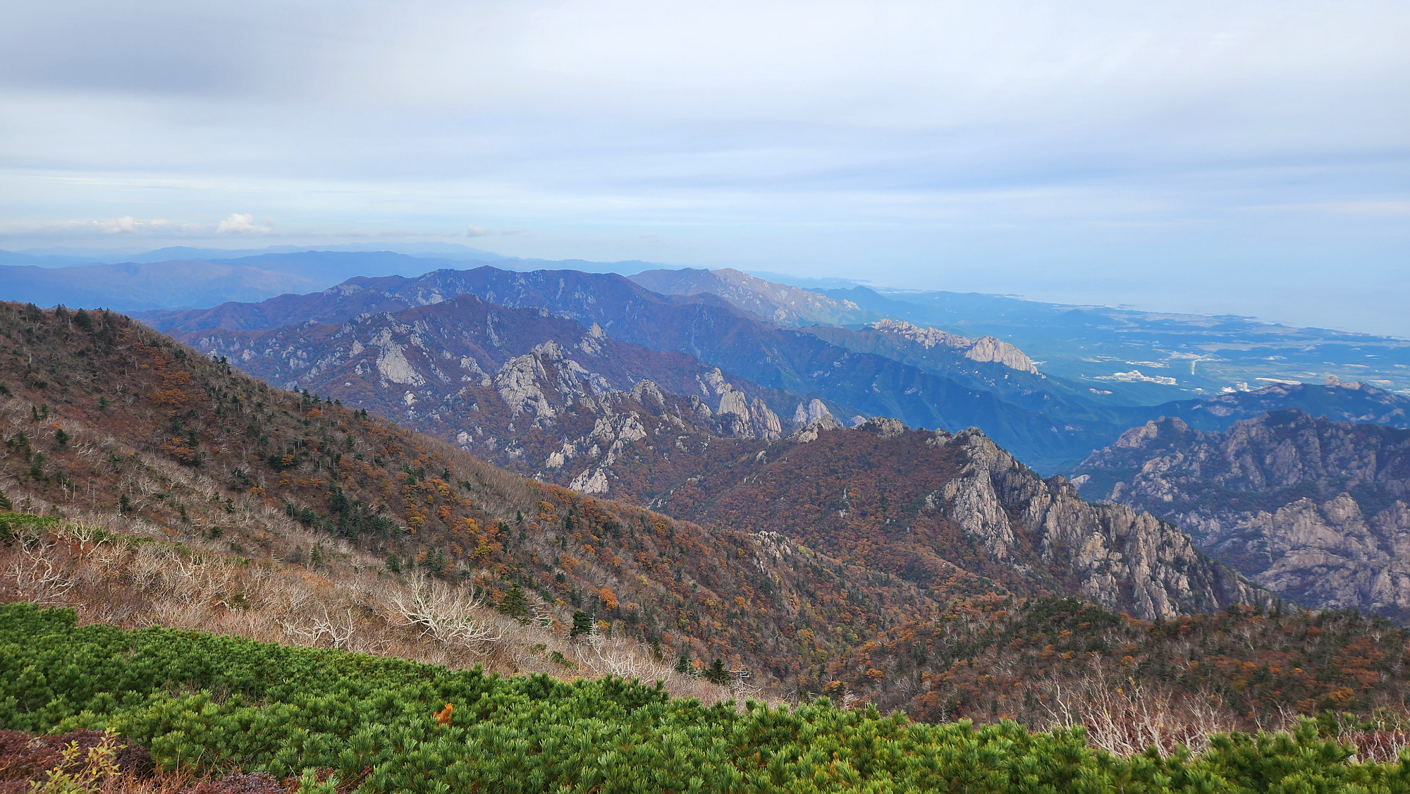 뒤로 울산바위가 아득히 보이고 뒤로 속초 앞 동해바다, 바다가 잘 보이지 않지만 육지 끝부터...!
