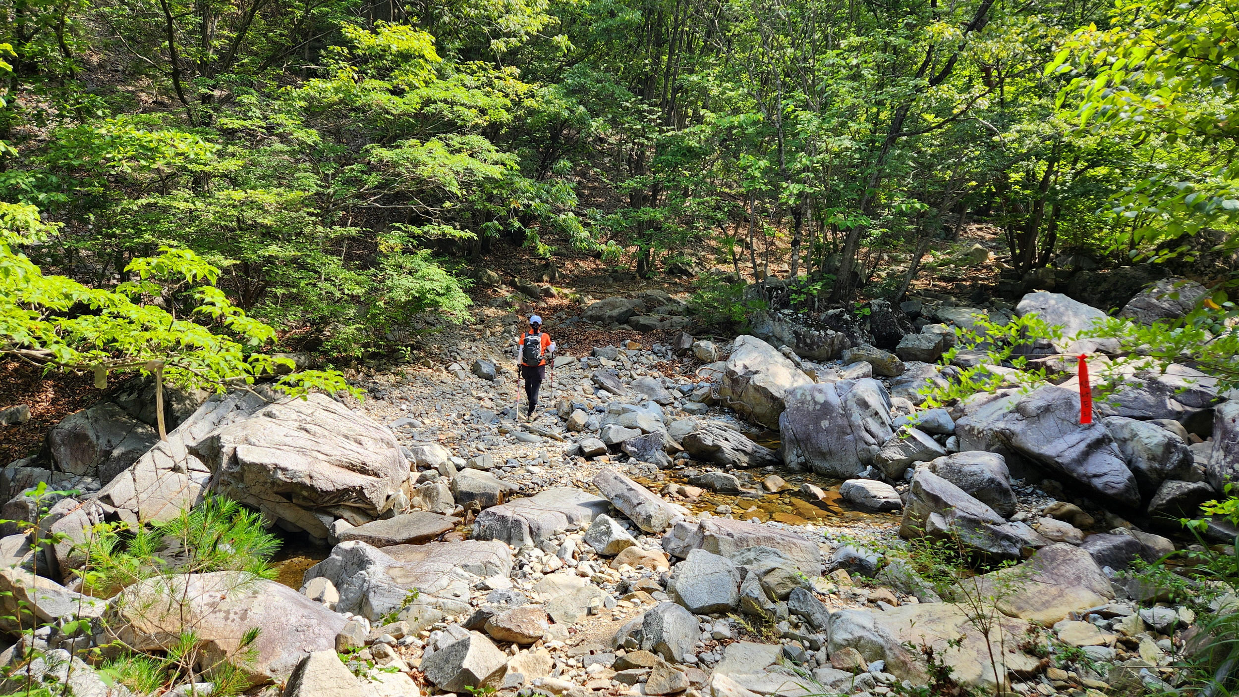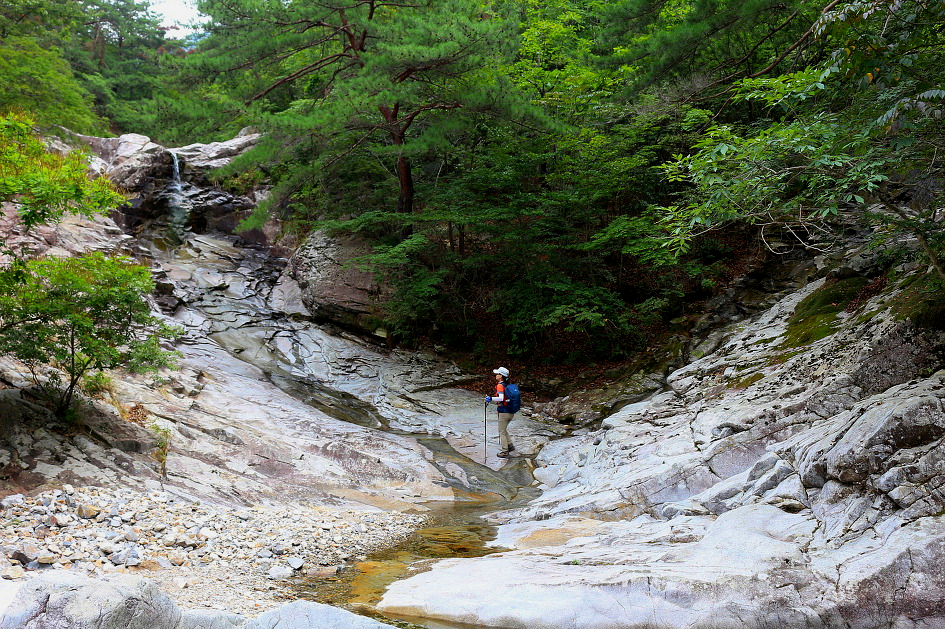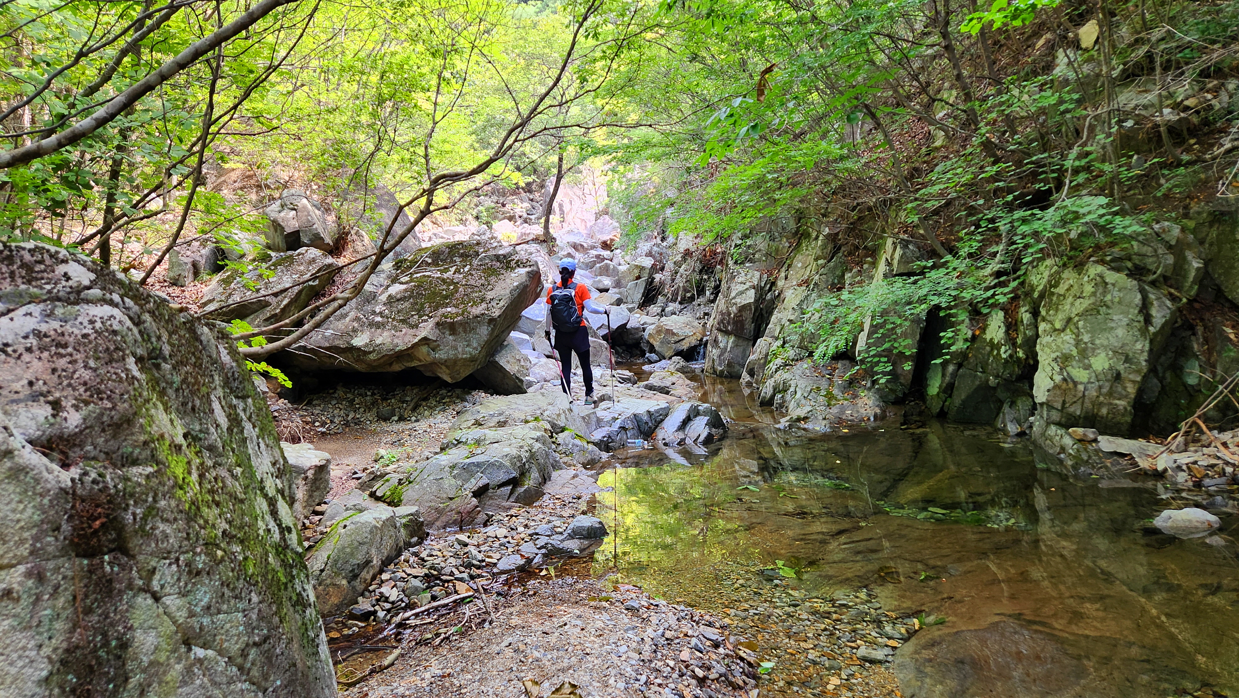 계곡을 건너는 지점에서 이제부터 계곡을 따라 오릅니다.