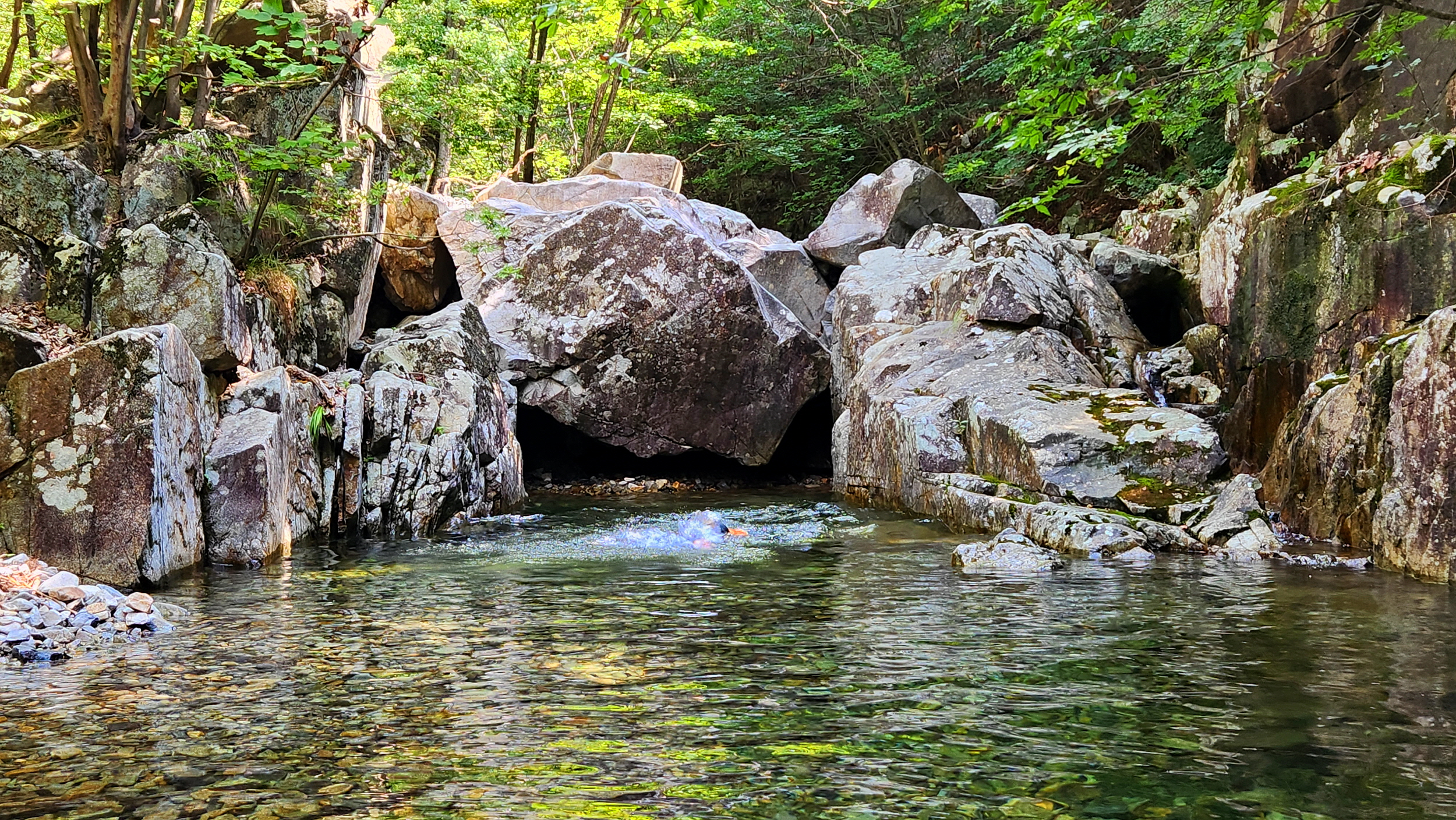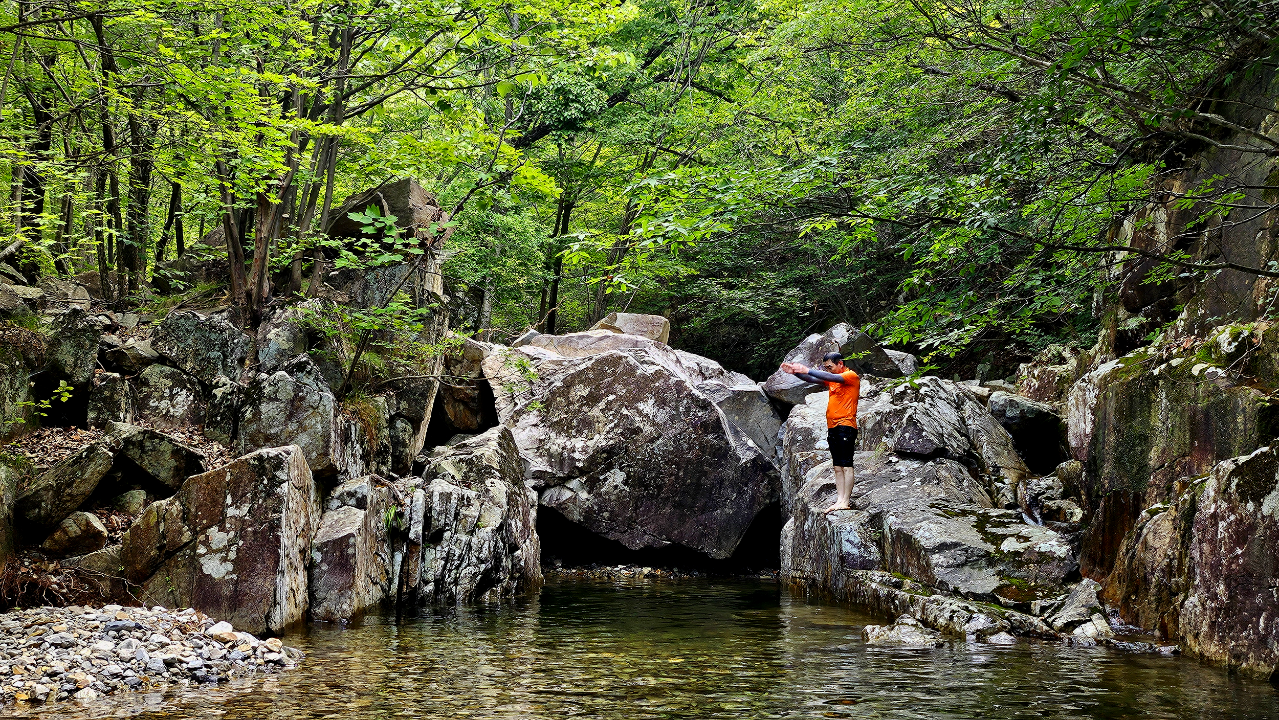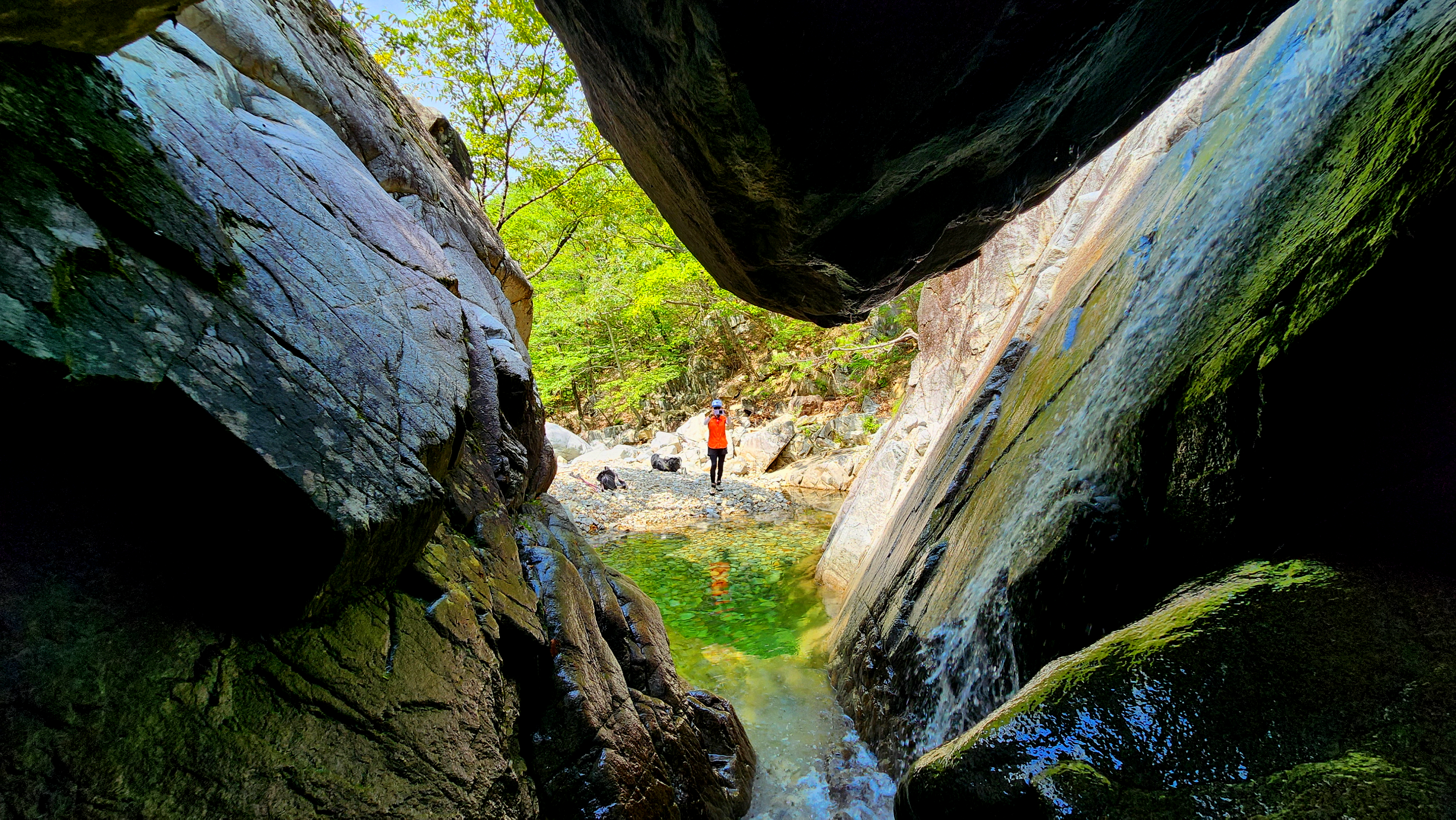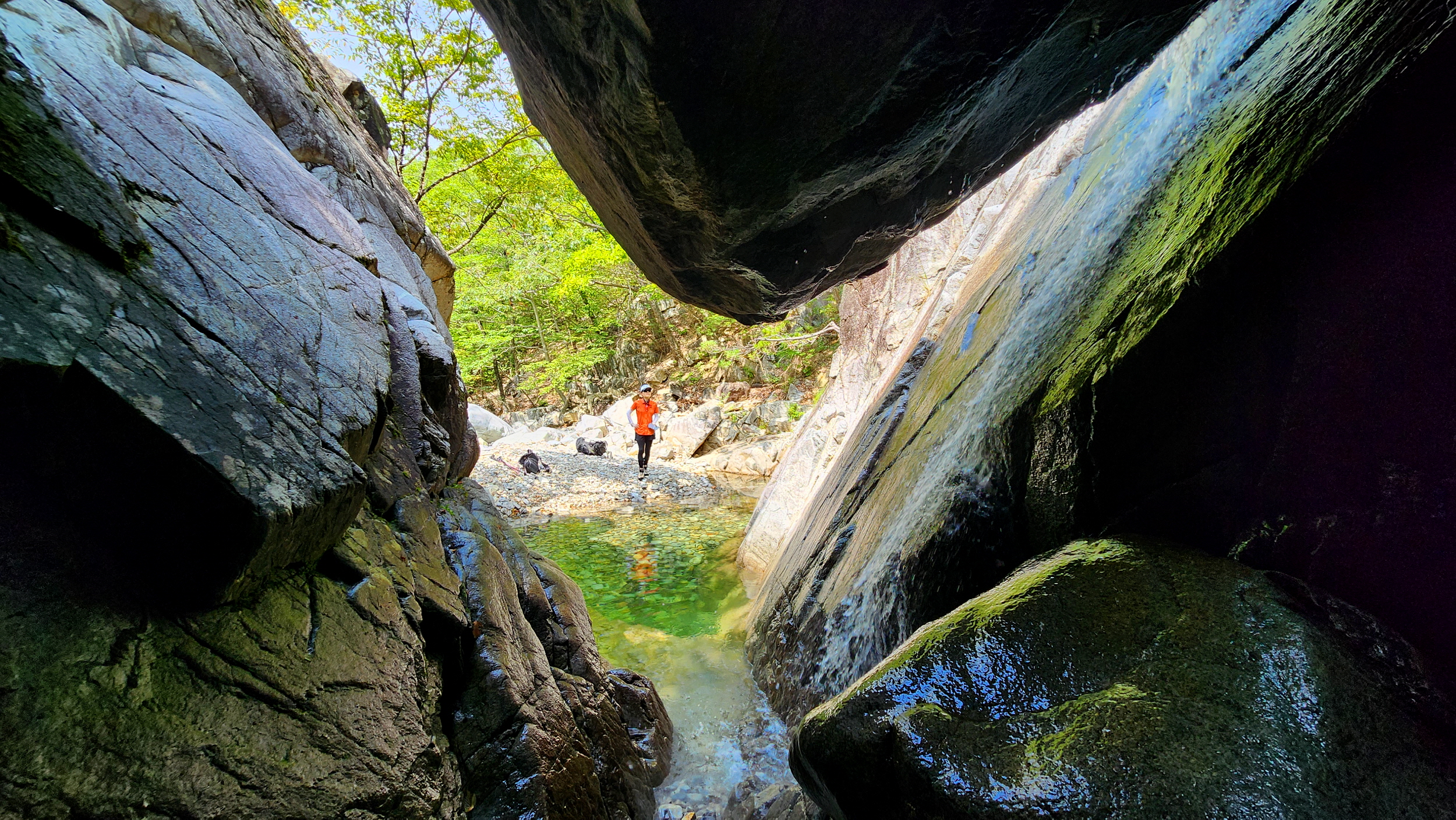 수리덤골 자연이 빛은 고인돌 석굴 문복산 수리덤계곡은 바로 옆 계살피계곡과 같이 많은 폭포는 없지만 간혹 나타나는 와폭과 깊고 푸른소가 계속 연이어지는 비경이 숨어 있는 곳으로 특히