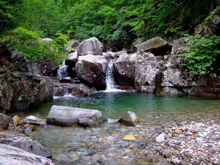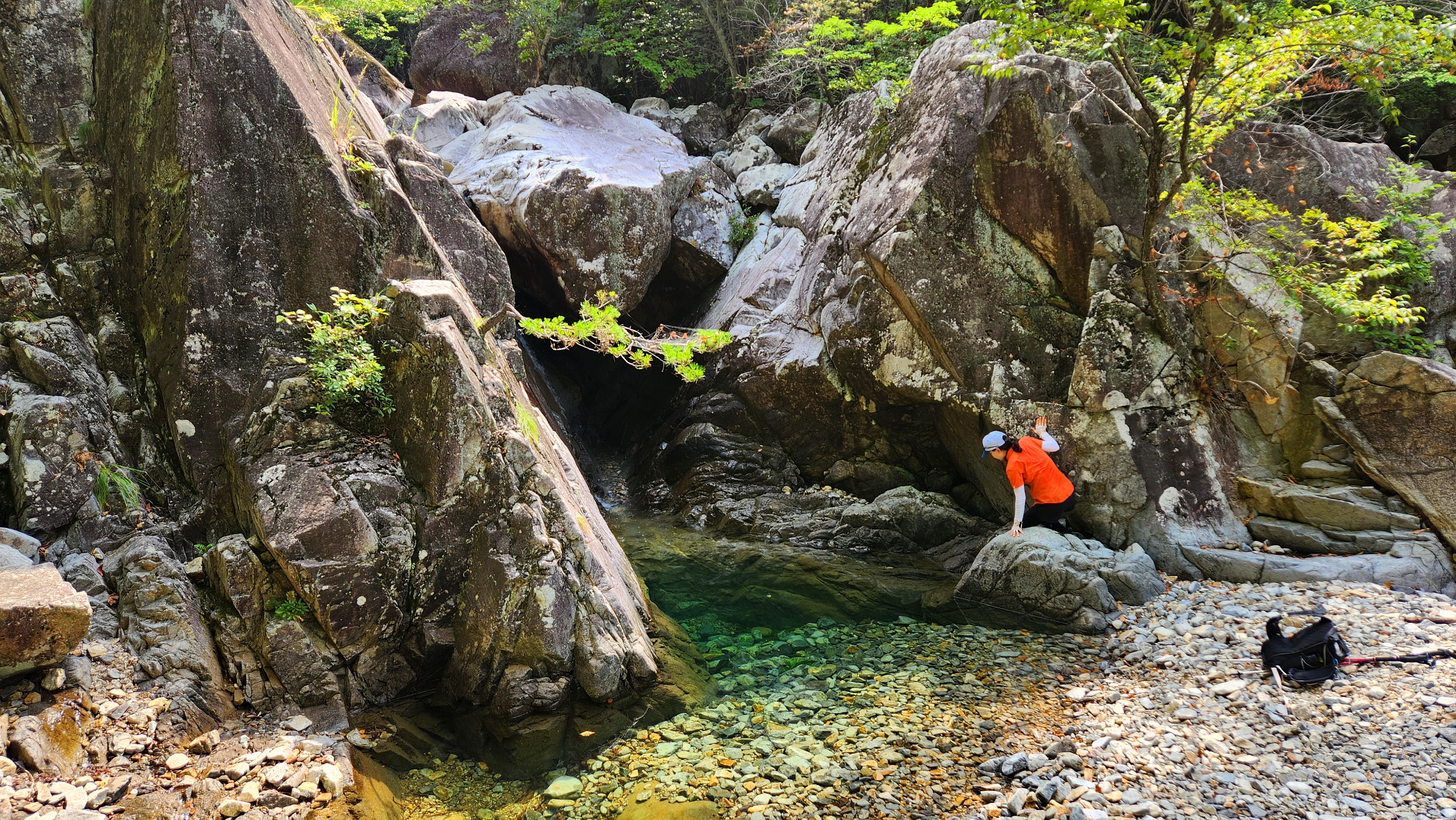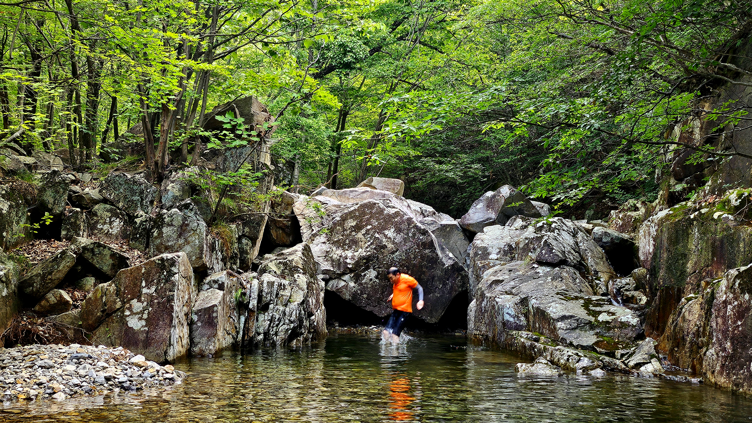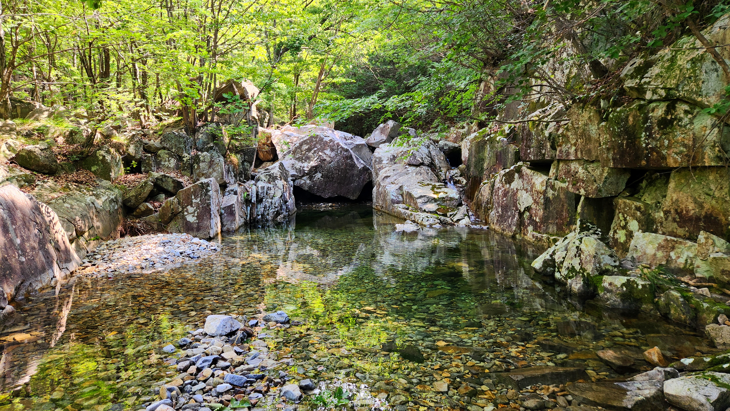 수리덤골 자연이 빛은 고인돌 석굴 문복산 수리덤계곡은 바로 옆 계살피계곡과 같이 많은 폭포는 없지만 간혹 나타나는 와폭과 깊고 푸른소가 계속 연이어지는 비경이 숨어 있는 곳으로 특히