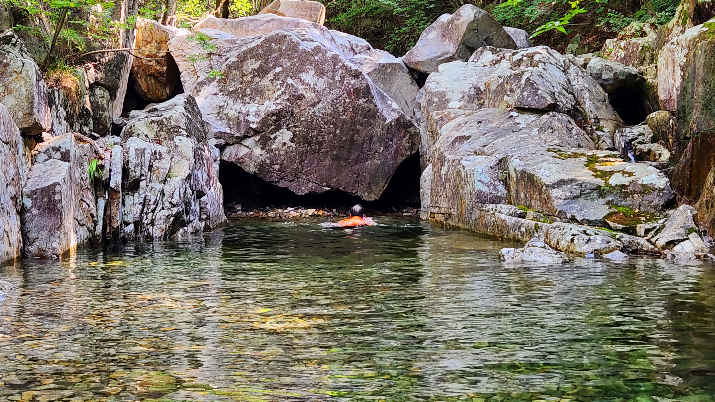 우측으로 와폭이 흐르고 좌측 바위 아래는 수심 깊은 곳으로 아래까지 천연풀장 입니다.