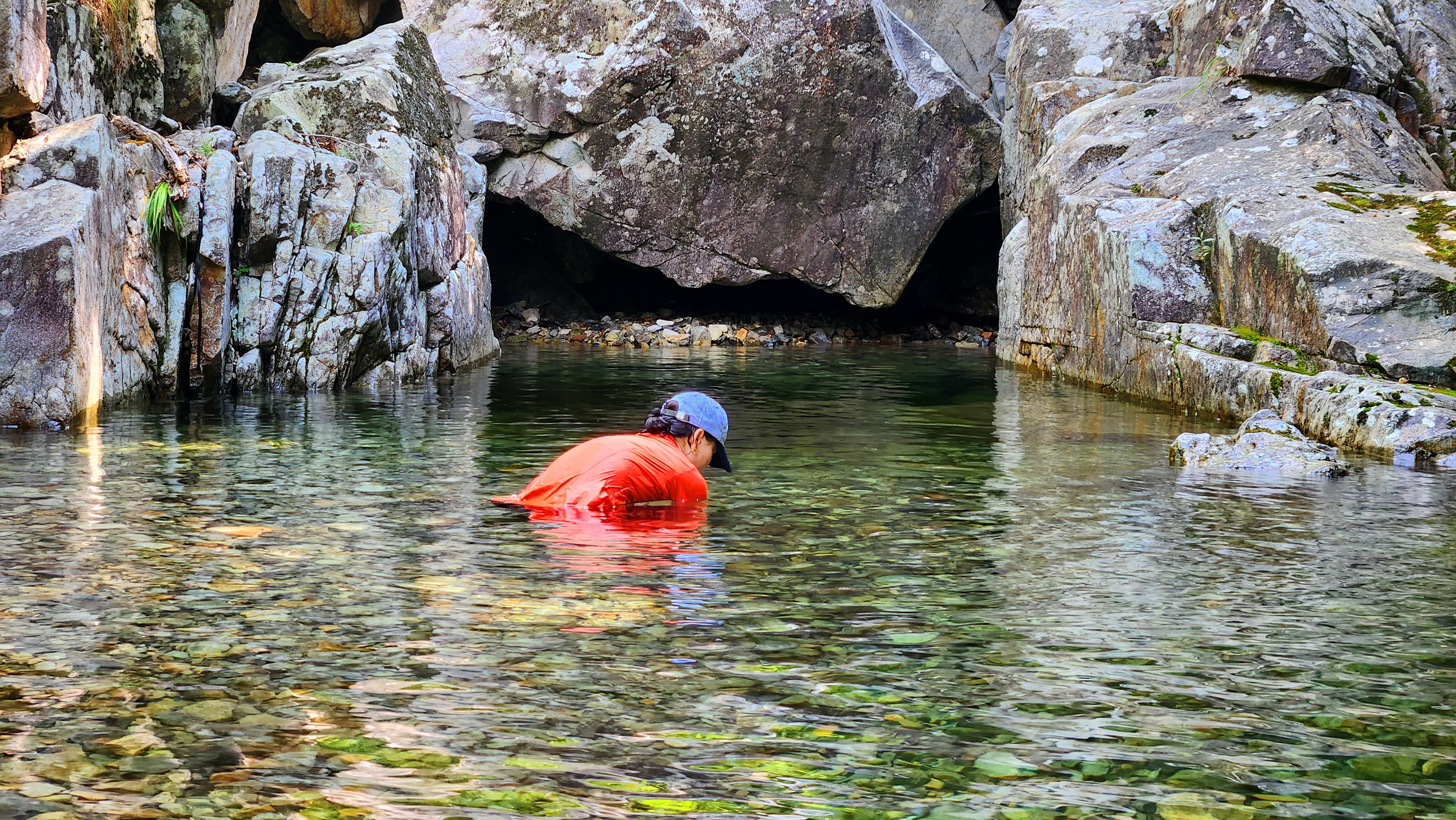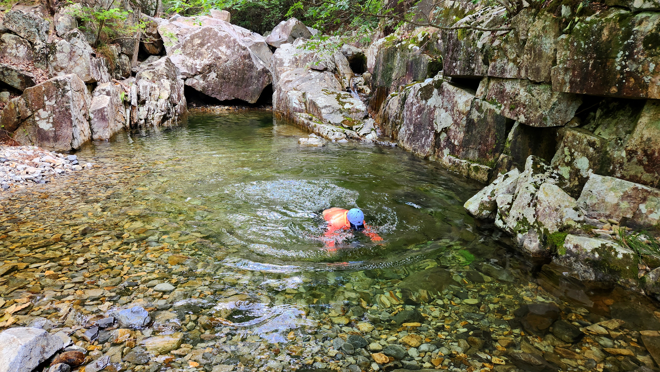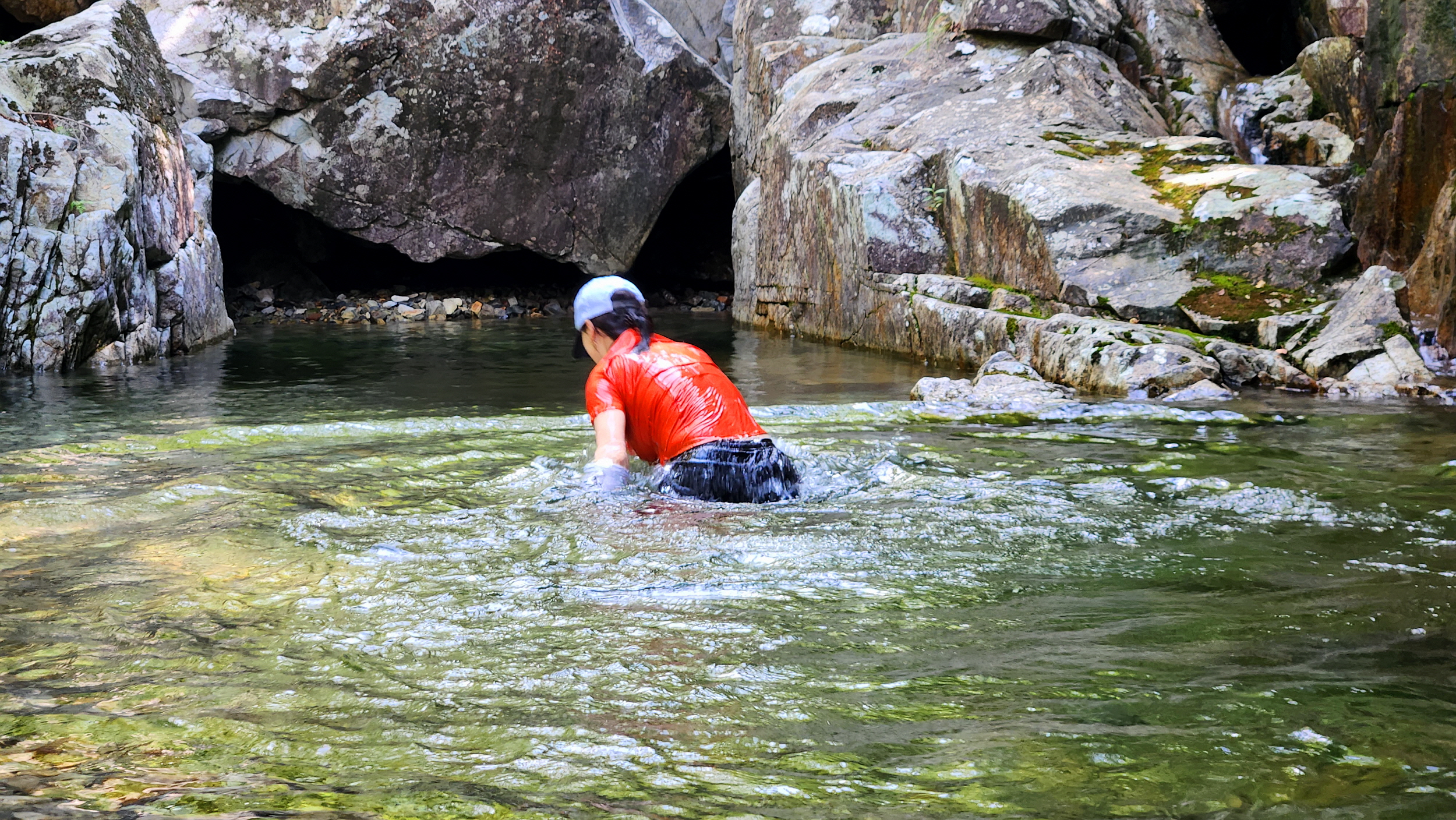 그리고 폭포소에 바로 뛰어들고, 역시 한키 넘는 수심입니다.