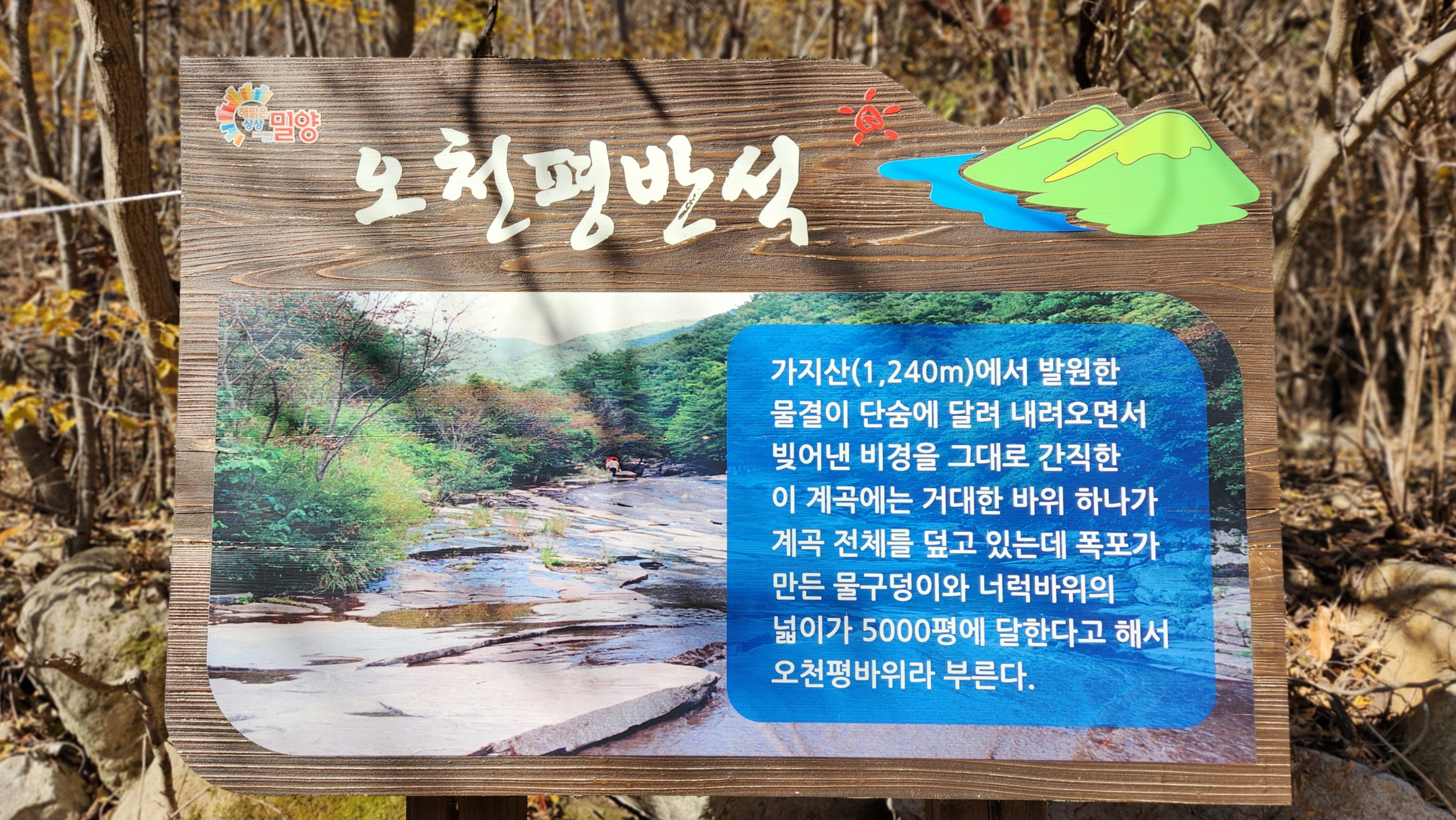 오천평반석은 가지산 중봉과 능동산에서 발원한 계곡 비경을 그대로 간직한 쇠점골 중간에 거대한 평탄한 너럭바위가 계곡 전체를 넓고길게 채우고 있는데, 그 크기가 넓어 오천평처럼 보인다 해서 오천평반석이라 부른다.
