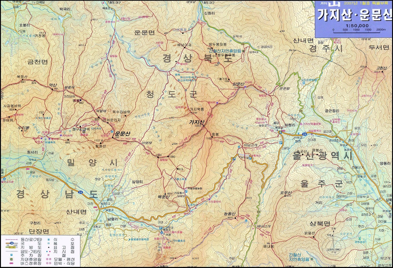 산경표에는 백두대간에서 낙동정맥이 영남 동부지방을 남북으로 뻗어 내리다 대구 영천 분지에서 산세를 낮추다 경주 단석산(827m)에서 고헌산(1,033m)으로 이어지며 다시 1,000m 이상의 준봉들이 솟구쳐 있다고 기록되어 있다. 영남알프스는 1979년 11월 군립공원으로 지정되었다.